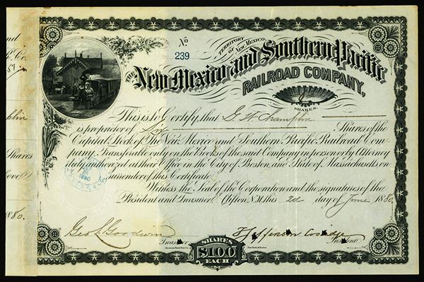 Clifton, New Mexico. 1 Share Capitol Stock, Issued and Uncancelled Certificate. Black print with ornate black border. Vignette of a locomotive at station on upper left with ornate title. Issued to and signed by T.Jefferson Coolidge and signed by Thomas Nickerson as president. Thomas Jefferson Coolidge (1831-1920) ã also known as T. Jefferson Coolidge. Great-grandson of Thomas Jefferson. President of the Atchison, Topeka and Santa Fe Railroad, and other companies; U.S. Minister to France, 1892-93. He was also a prominent figure in the Sonora Railway, California Southern Railroad and Mexican Central Railway, all subsidiary companies of the Santa Fe Railroad.