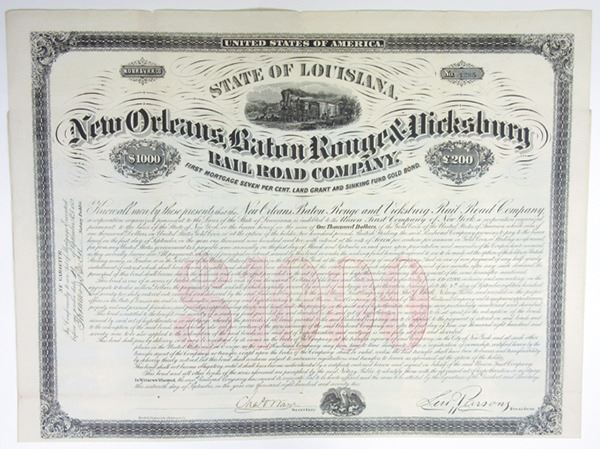 Louisiana. $1,000 Issued 7% First Mortgage Land Grant and Sinking Fund Gold Coupon Bond, Black print on black border with red under tint, Company title at top with small illustration of locomotive above, Fine-VF condition with minor splitting at fold lines, Maverick, Stephans & Co.