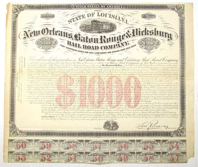Louisiana, 1872. $1000 Unissued 7% First Mortgage Land Grant and Sinking Fund Gold Coupon Bond, Black print on black border with red under tint, Company title at top with small illustration of locomotive above, S/N 7587, VF to VF+ condition with minor splitting at fold lines, Maverick, Stephans & Co.
