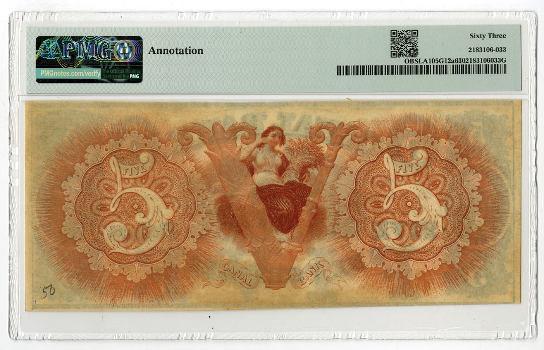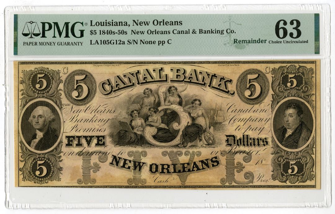New Orleans, Louisiana, 1840s-50s. $5, LA105G12a, Remainder Obsolete Banknote, Black on gray underprint, Large group of allegorical women at center, George Washington at left and Gentleman at right, S/N None pp C, PMG graded Choice Uncirculated 63 with comment "Annotation." TC&C.