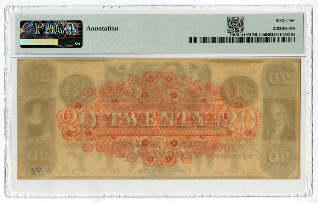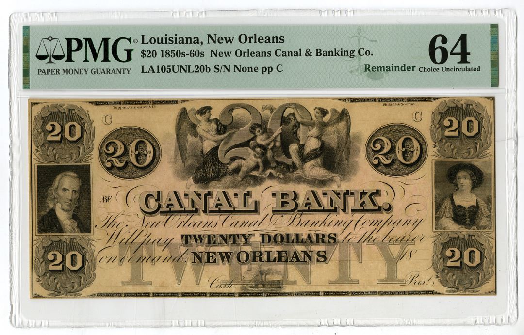 New Orleans, Louisiana, 1850s-60s. $20, LA105UNL20b, Remainder Obsolete Banknote, Black on gray underprint, Large group of allegorical figures at center, Portraits of people at left and right sides, S/N None pp C, PMG graded Choice Uncirculated 64 with comment "Annotation." TC&C.