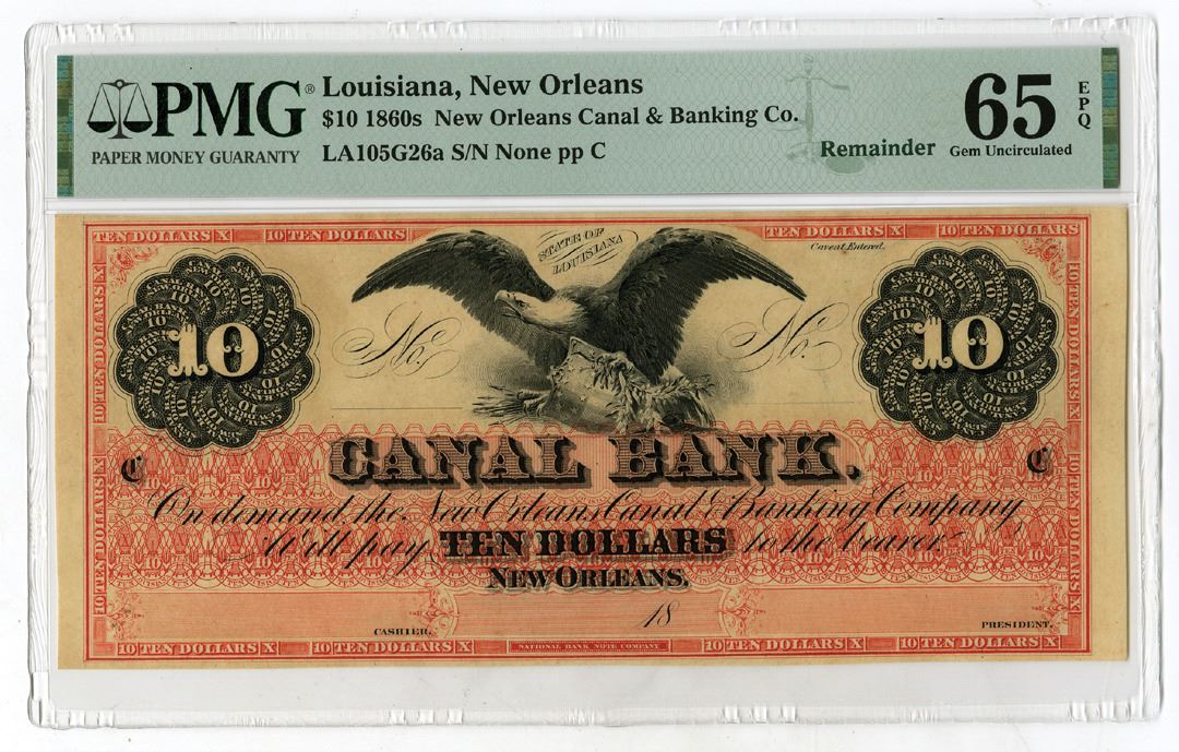 New Orleans, Louisiana, 1860s. $10, LA105G26a, Remainder Obsolete Banknote, Black on red underprint with Bald Eagle at top center, S/N None pp C, PMG graded Gem Uncirculated 65 EPQ. National BNC