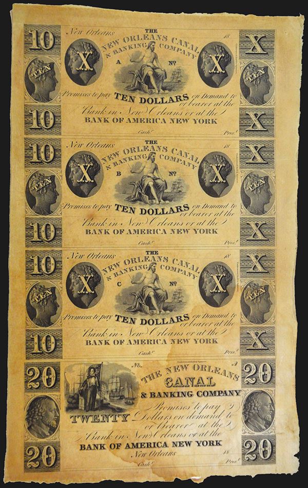 LA. $10-10-10-20. Neptune seated on first three, Sailor with flag and ships on fourth. Paper tone, water stain. UB&S. Uncirculated.