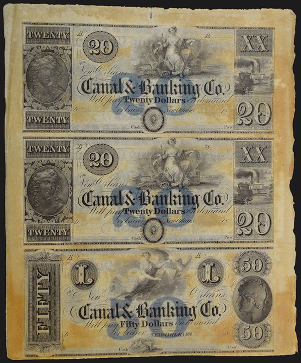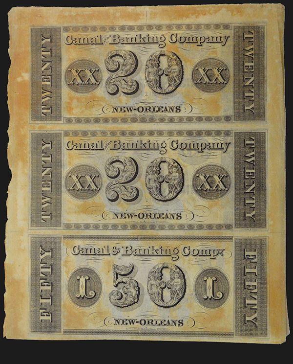 LA. $20-20-50. Female with eagle. Black back. Three of the 4 note sheet. RWH&E. Paper tone. Uncirculated.