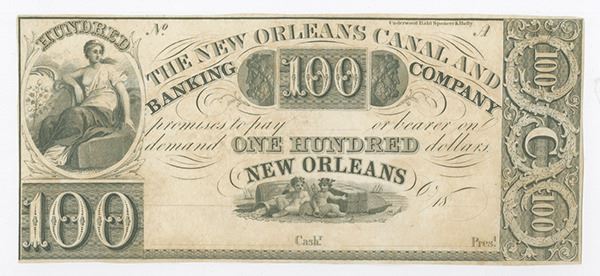 New Orleans, Louisiana. $100, Cr-N-338Hx-105-G52, Remainder banknote, black printing without underprint, helmeted cameo portraits top middle flank middle "100" counter, Seated allegorical woman at left, cherubs at bottom, blank back, Choice Uncirculated, UBSH