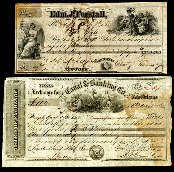 New Orleans Civil War Era Exchange and Check Pair. Lot of 2 Exchange Drafts, both date lined New Orleans, Louisiana. Includes Edm. J. Forstall, 1866, $19,949.24, “First Check”, Punch Cancelled, with ink burn and a few small holes, still very attractive check, ABNC; and August 16, 1862, Canal & Banking Co., Nautical View of Poseidon with trident; issued for £100.00, New Orleans was captured from the confederates the beginning of May 1862, this exchange was issued barely 2 months after its capture by the Union Army, Choice Fine with some staining, RWH&E, New Orleans. Scarce and attractive pair of exchanges.