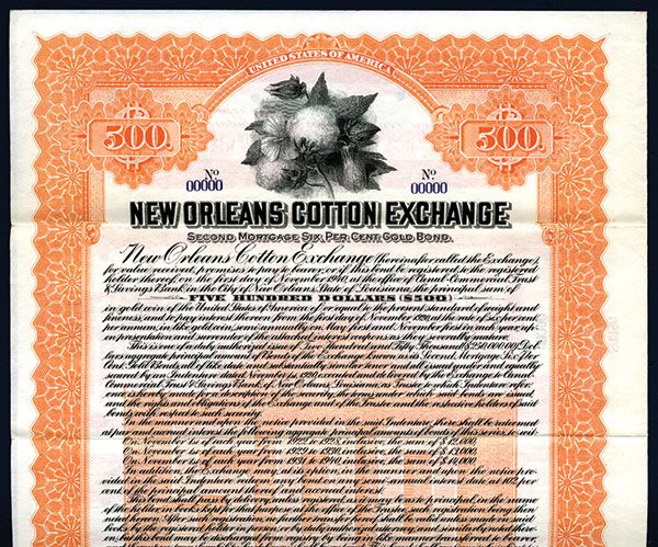 Louisiana. 1920. $500 6% Specimen Bond. Black print with orange border and underprint. Cotton flower top center. VF-XF condition. POC's and red SPECIMEN overprints. ABNC.