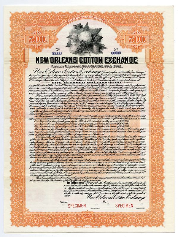 Louisiana, 1920, $500, 6% 2nd Mortgage Gold Bond, Specimen Bond, Coupons attached, Black on orange border and underprint, Vignette of a cotton plant top center, Red SPECIMEN overprints and POC's with blue s/n "00000", VF-XF condition, ABNC.