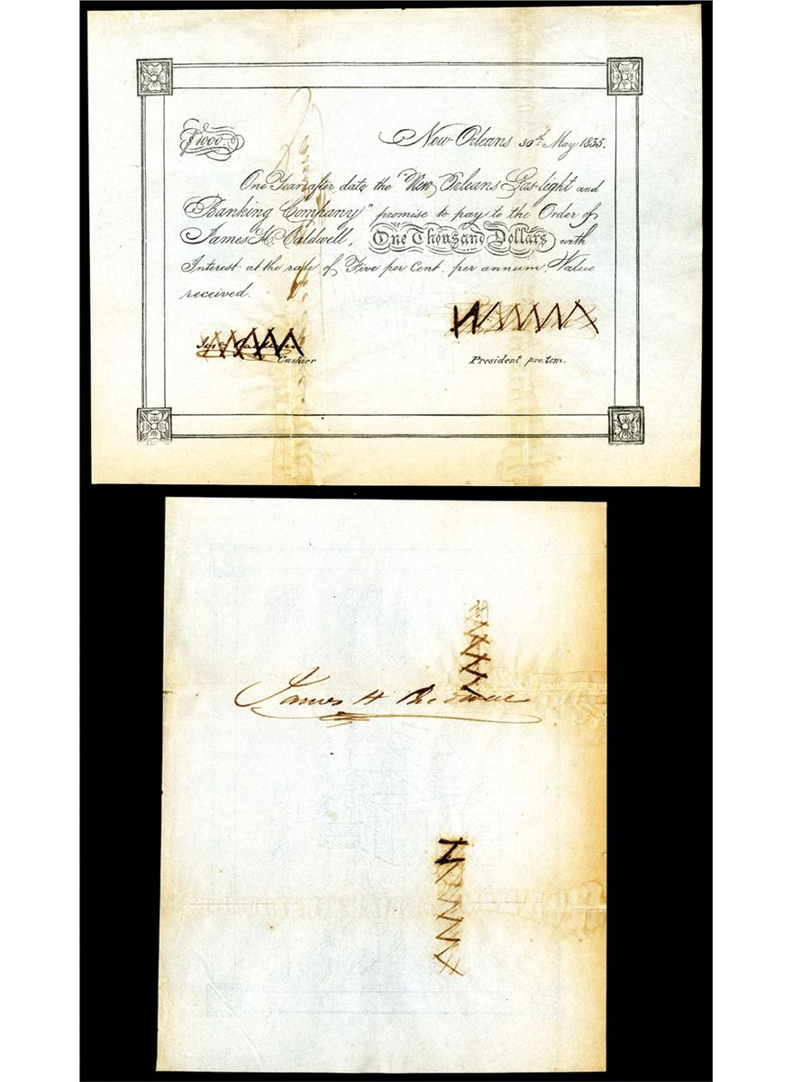 New Orleans, $1000 5% Bond, Signatures crossed out on bottom and back endorsed. Quaint and relatively primitive design but extremely rare and desirable, Choice Fine with toning at folds.