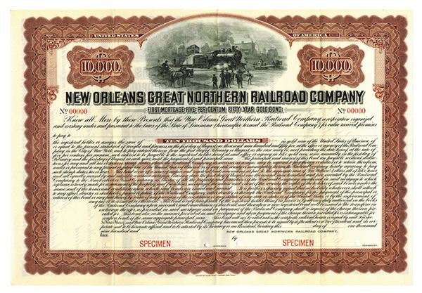 Louisiana. $10,000 Specimen 5% 1st Mortgage Registered Gold Bond, Black print on brown border and under tint in horizontal format, Image of people waiting for locomotive to pass at level crossing, Specimen overprints, POC's, VF-XF condition. ABNC.