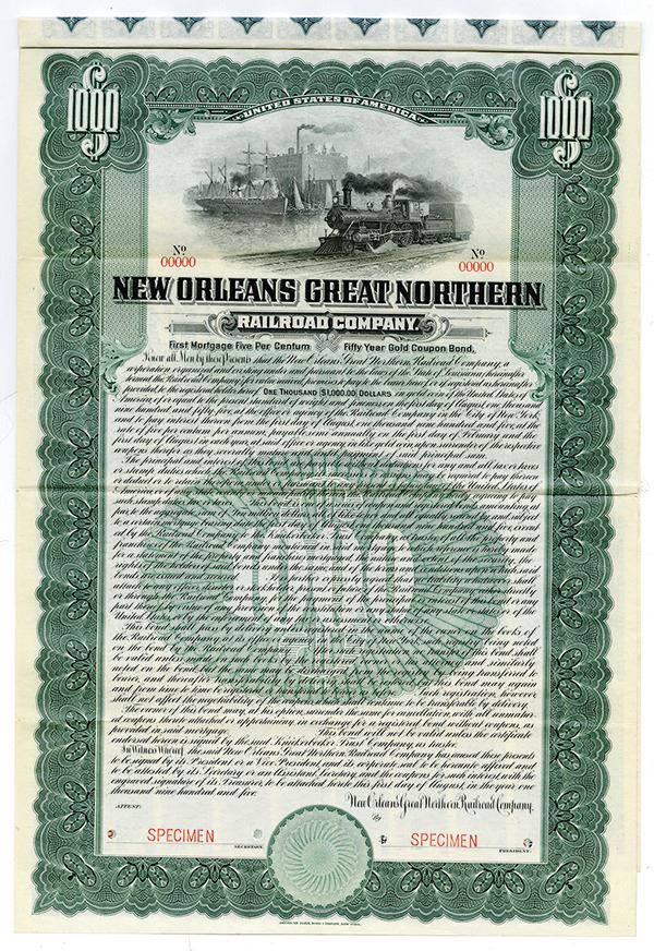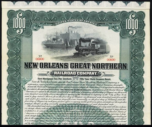 Louisiana, 1905, Horizontal $1000 Specimen Bond certificate, 1st Mortgage 5% 50 year Gold Coupon Bond, Black on dark blue border and underprint, Specimen overprints, POCs, XF. SCBNC. Listed railroad and bond in Cox.