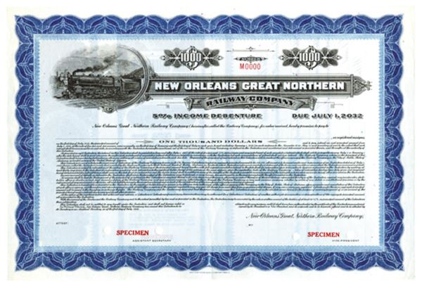 Louisiana. $1000 Specimen 5% Registered Income Debenture Bond, Black print on blue border and under tint in horizontal format, Locomotive in profile at top left corner, Specimen overprints and POC's, VF-XF condition, SBNC.