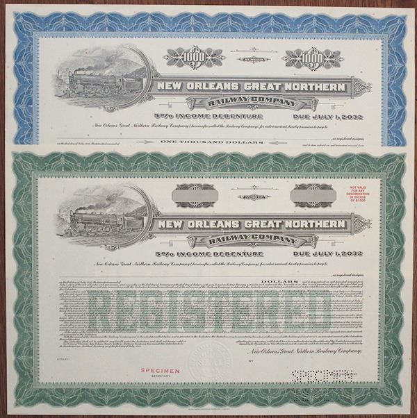 Louisiana. Lot includes 2 pieces: $1000 Specimen 5% Registered Income Debenture Bond in blue; $Odd Specimen 5% Registered Income Debenture Bond in green. Both have Specimen overprints, Specimen POCs, and are in XF condition. SCBN. Green bond is a rare specimen in Cox.