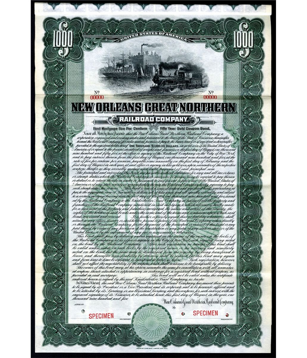 New Orleans, Louisiana, 1905, $1000 Specimen 1st Mortgage 5% 50 year Gold Coupon Bond, Black on dark green border and underprint, Specimen overprints, POCs, XF. ABNC.
