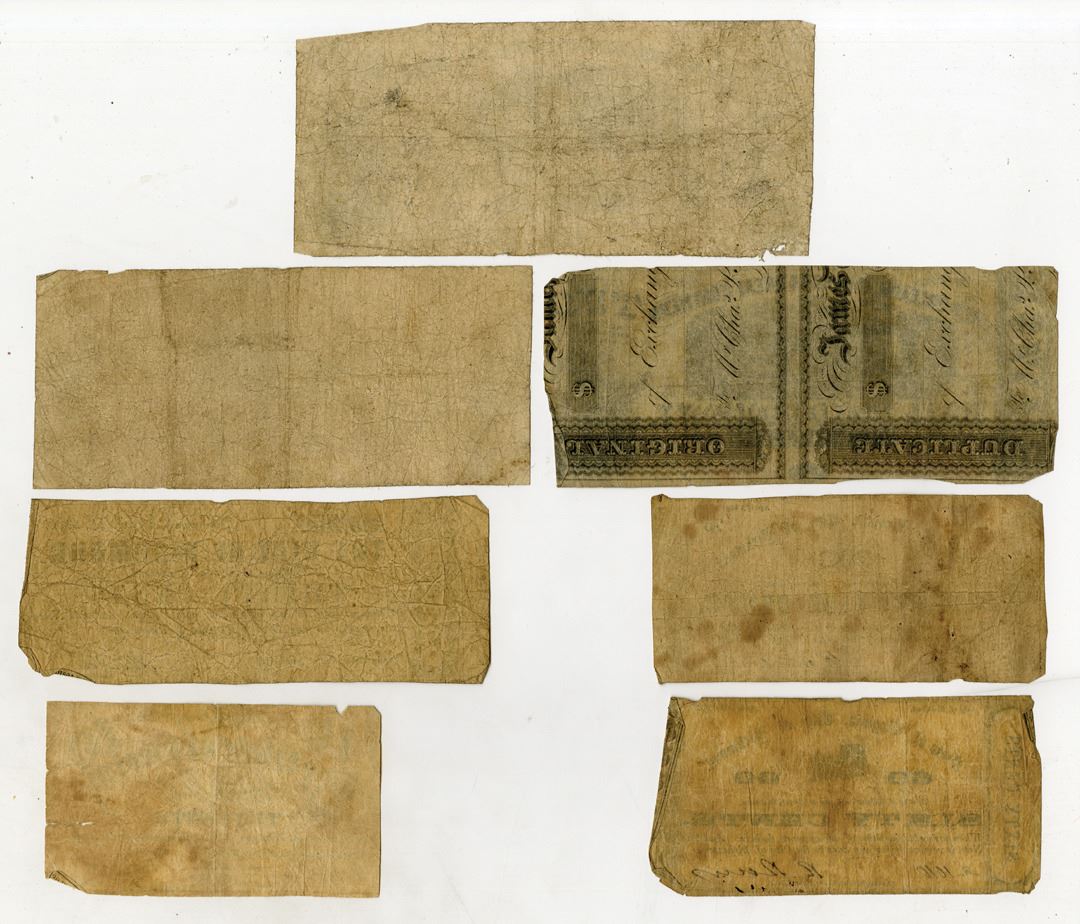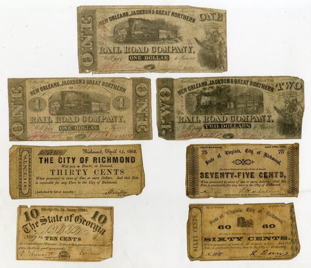 Louisiana and Georgia, 1861-63. Lot of 7 obsolete banknotes, includes: 3 different varieties of 1861, New Orleans, Jackson & Great Northern Co., $1 (2) & $2, obsolete notes, all are in VG condition with a lot of wear; City of Richmond 30 Cents, 60 Cents, & 75 Cents; and, State of Georgia 10 Cents. Notes are in VG to Choice VG condition. (7). Sold "AS IS" no returns accepted.