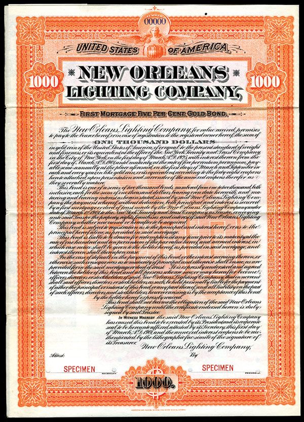 1901. $1000 5% Specimen Bond. Black print with orange border and underprint. No vignette. POC's and red SPECIMEN overprints. VF-XF condition. ABNC.