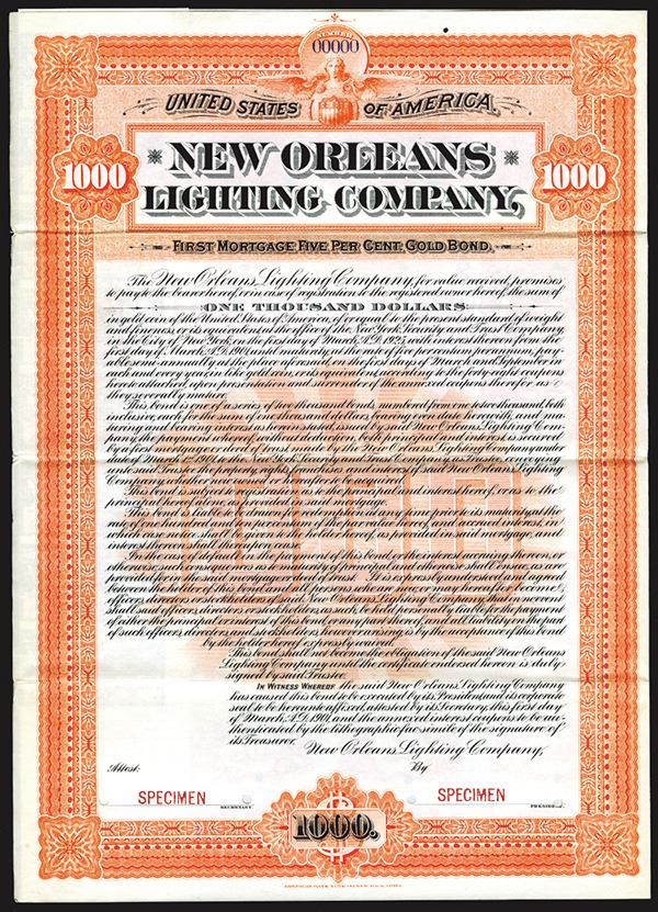 1901. $1000 Specimen 5% Bond. Black print with orange border and under print. No vignette. POC's and red SPECIMEN overprints. VF-XF condition. ABNC.