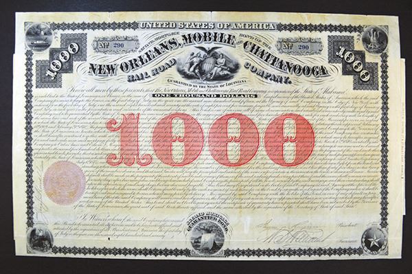Alabama (Guaranteed by the state of Louisiana). $1000 8% Coupon Bond. Edge plate notation that this was the Calcasieu Division 1st and 2nd Mortgage Bonds. Issued. Light paper separation at folds, light paper tone. National BNC. Very large format.