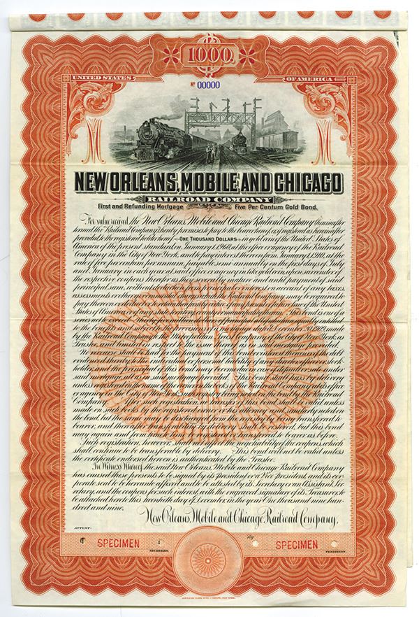 Alabama, Missouri, & Tennessee. $1000 Specimen 5% 1st and Refunding Mortgage Gold Coupon Bond, Black print on large orange border and under tint, Men standing between tracks at railyard at top, Specimen overprints and POC's, VF-XF condition, ABNC.
