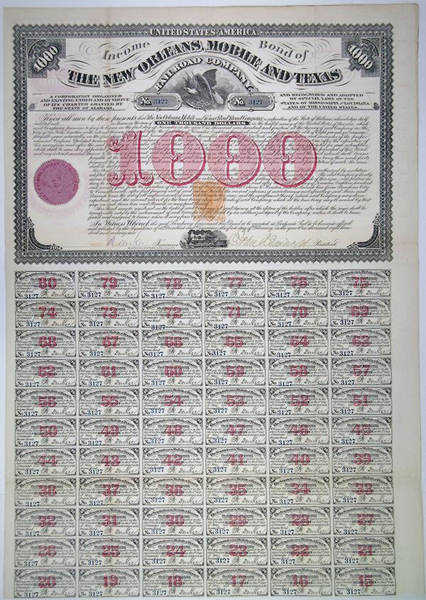 Alabama. $1,000 Issued 8% Income Coupon Bond, Black print on black border with red under tint and orange seal undertint, Bald Eagle with shield at top, and small locomotive in profile at bottom, VF-XF condition, Henry Seibert & Bros.