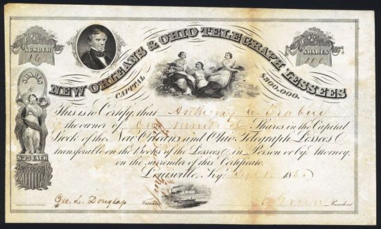 Louisville, Kentucky, 1858, 100 Shares, Issued and Uncancelled Stock, #168, Black on black border and underprint, Three reclined allegorical women top center, modes of transportation on right and various fruits on left with a portrait possibly of Norvin Green, VF condition with folds and paper discoloration, Toppan Carpenter & Co., Green was future president of Western Union. During the Civil War, Norvin was superintendent of the South Western Telegraph Company. The government asked him to discontinue doing business with the Confederacy and to allow a temporary managing superintendent to be placed in charge by General McClellan. Rare, attractive and one of the first telegraph certificates.