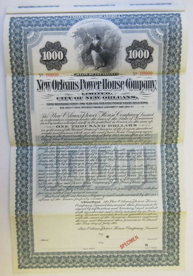 New Orleans, Louisiana. 1901, $1,000 Specimen 5% 1st Mortgage Forty Year Power House Gold Coupon Bond, Black print on blue/gray border and under tint, Allegorical woman with lightening bolts at top, Specimen overprints and POC's, VF-XF condition, ABNC.