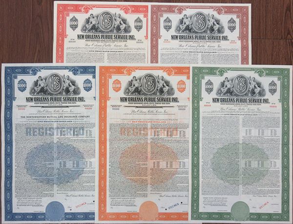 New Orleans, Louisiana. Lot includes 5 pieces: 1948 $1000 Specimen 3 1/4% First Mortgage Coupon Bond, Black text with red border and undertint; 1953 $1000 Specimen 4 1/8% First Mortgage Coupon Bond, Black text with brown border and undertint; 1944 $1000 Specimen 3 1/8% First Mortgage Coupon Bond, Black text with green border and undertint; ND (1940s) $1000 Specimen 3 1/8% Registered First Mortgage Bond, Black text with blue border and undertint; ND (1940s) $10,000 Specimen 3 1/8% Registered First Mortgage Bond, Black text with orange border and undertint. All are in VF condition with red specimen overprints, "00000" serial numbers, POC's, and have been printed by ABNC. 5 pieces