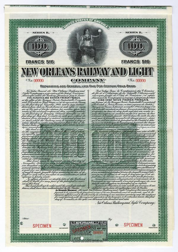 New Orleans, Louisiana. $100 Specimen 5% Series B, Refunding and General Gold Coupon Bond, Black print on green border and under tint, Image of seated female with lightbulb held aloft, Specimen overprints and POC's, VF-XF condition, ABNC. Listed railroad, unlisted as a specimen.