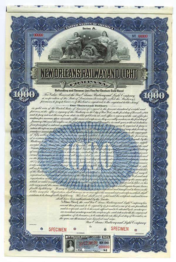New Orleans, Louisiana. $1000 Specimen 5% Refunding and General Lien Gold Coupon Bond, Black print on ornate large blue border and under tint, Image of 2 females sitting next to a generator. Specimen overprints and POC's, VF-XF condition, ABNC. Only known as a specimen.