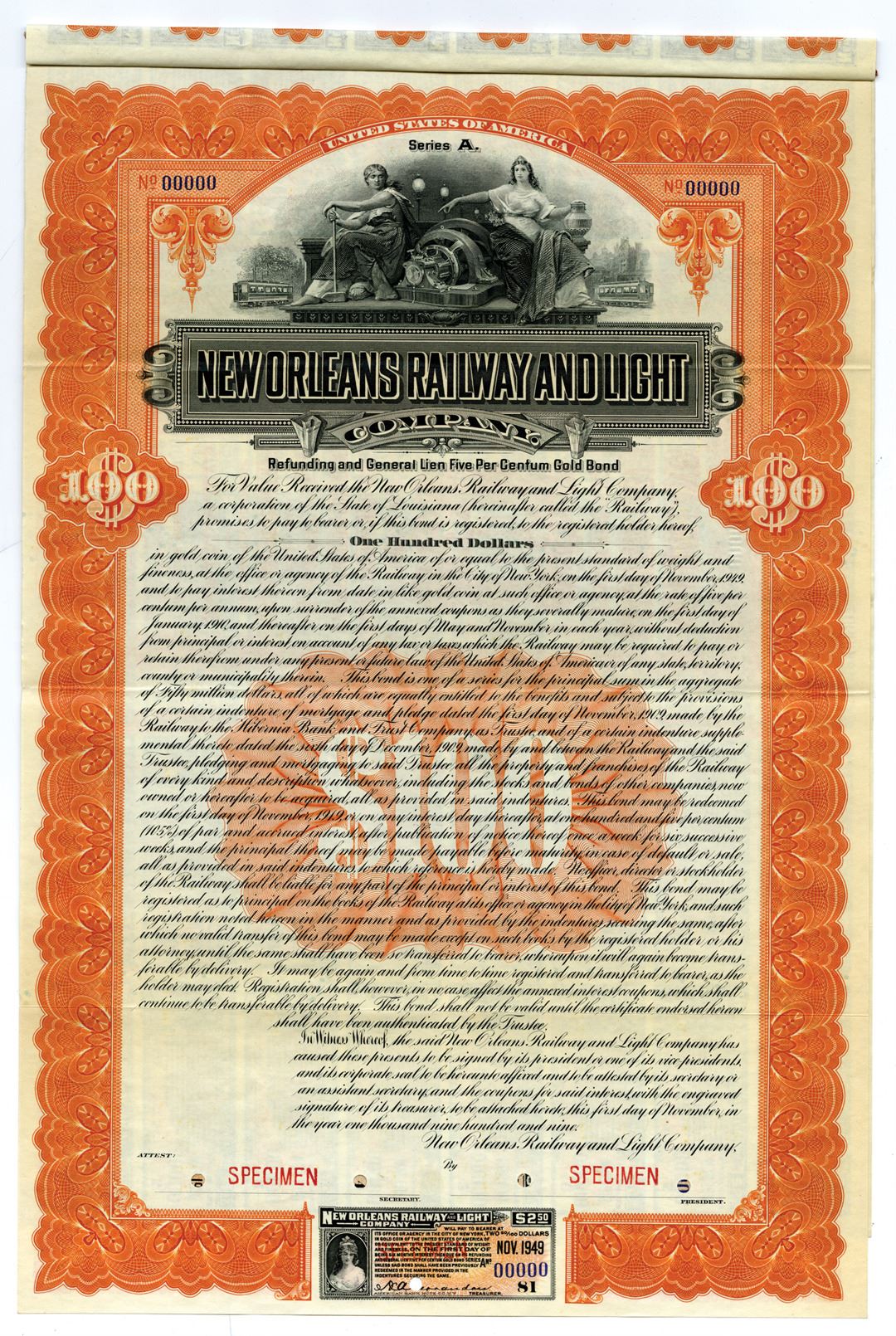 Louisiana. $100 Specimen 5% Refunding and General Lien Gold Coupon Bond, Black print on large orange border and under tint, Allegorical women at top sitting on a generator, Specimen overprints and POC's, VF-XF condition, ABNC.
