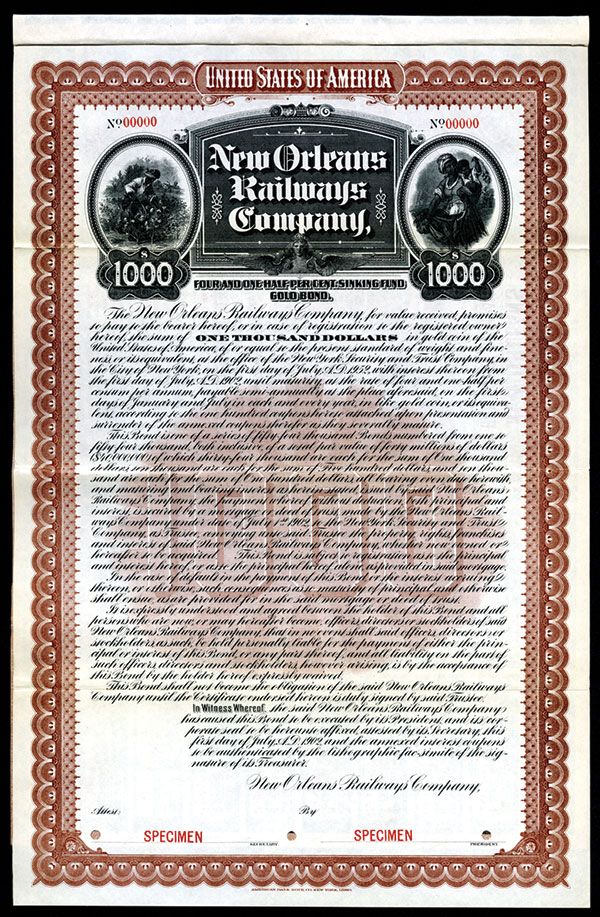4 1/2% Sinking Fund Gold Coupon Bond, Brown border and underprint, African American cotton farmers flanking title top center, VF condition, ABNC. Listed railroad but only listed as stock no known bonds in Cox.