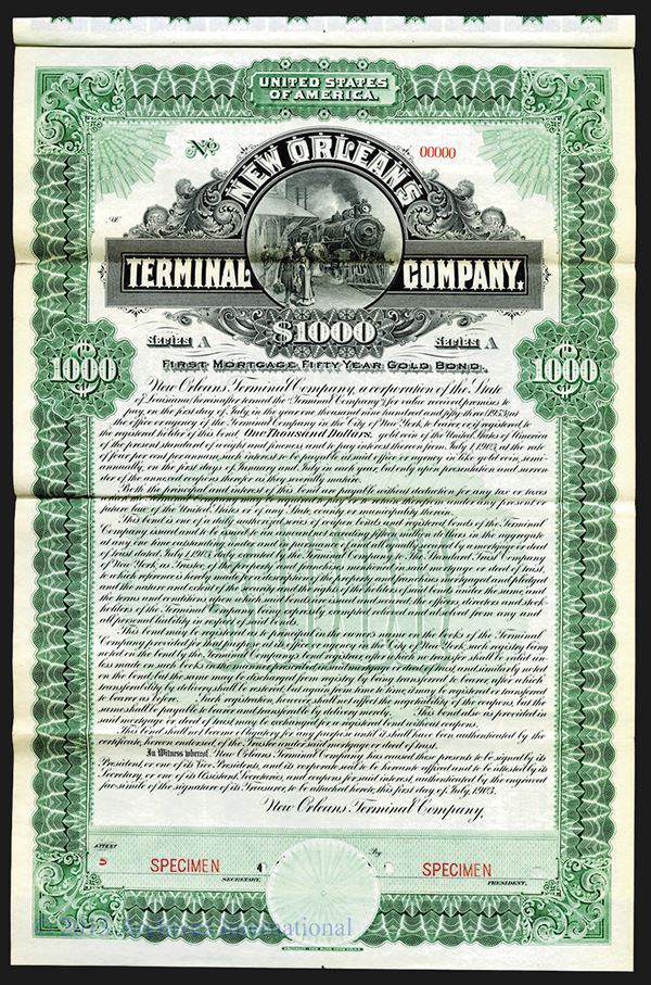 Louisiana. 1903. $1000 Series A 4% Specimen Bond. Black print with green border and underprint. Locomotive at station top center. POC's and red SPECIMEN overprints. VF-XF condition, FLBNC. Listed railroad in Cox but unlisted bond denomination.