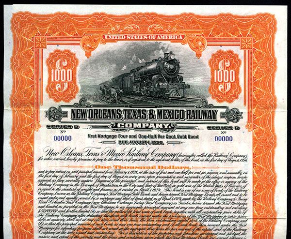 Louisiana. 1928. $1000 4 1/2% Series D Specimen Bond. Black print with orange border and underprint. Locomotive passing railway workers top center. POC's and blue SPECIMEN overprint. VF-XF condition. ABNC. Listed railroad but unlisted bond series and earlier date than listed in Cox.