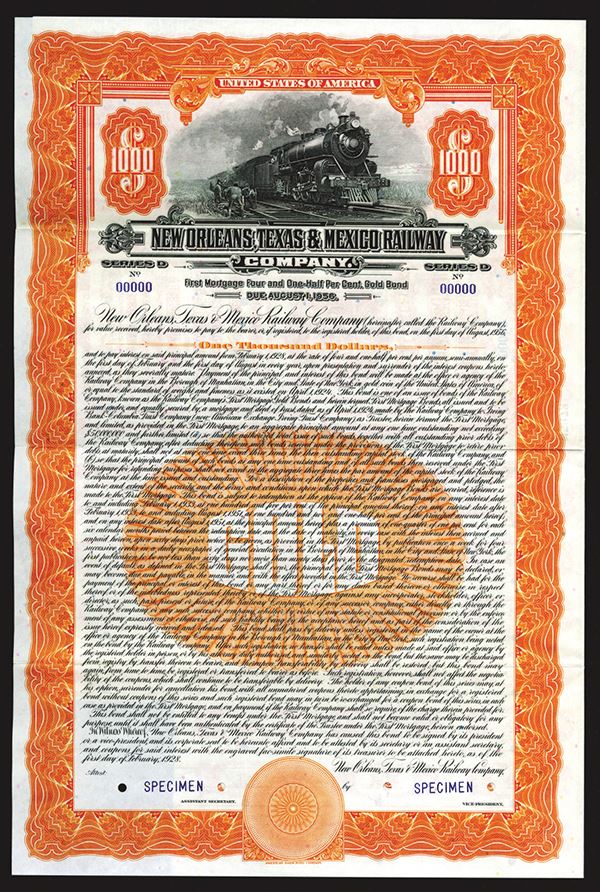 Louisiana. 1928. $1000 4 1/2% Series D Specimen Bond. Black print with orange border and underprint. Locomotive passing railway workers top center. POC's and blue SPECIMEN overprint. VF-XF condition. ABNC. Listed railroad but unlisted bond series as a coupon bond.