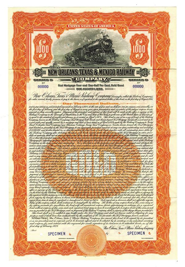 Louisiana. $1000 Specimen 4 1/2% 1st Mortgage Gold Series D Coupon Bond, Black print on large orange border and under tint, Image of locomotive passing men working on tracks, Specimen overprints, POC's, VF-XF condition, ABNC. Listed Railroad on Cox, Unlisted Series Type.