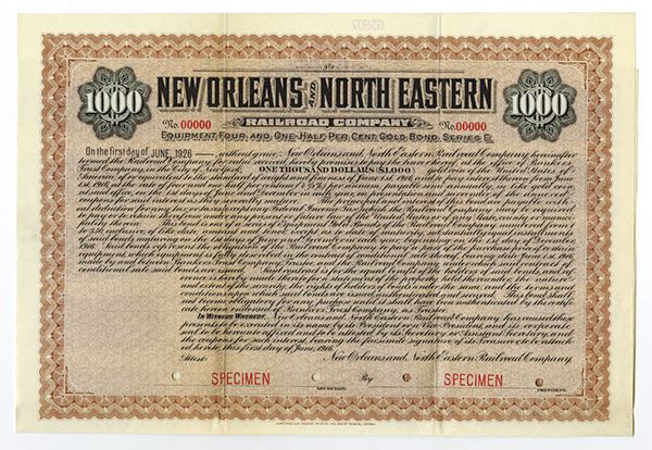 New Orleans, Louisiana. $1000 Specimen 4 1/2% Series E, Equipment Gold Coupon Bond, Black print on brown border and under tint, small sized certificate in horizontal format, no vignette on certificate, Specimen overprints and POC's, VF-XF condition, ABNC. Listed Railroad on Cox, Unlisted Bond Type.