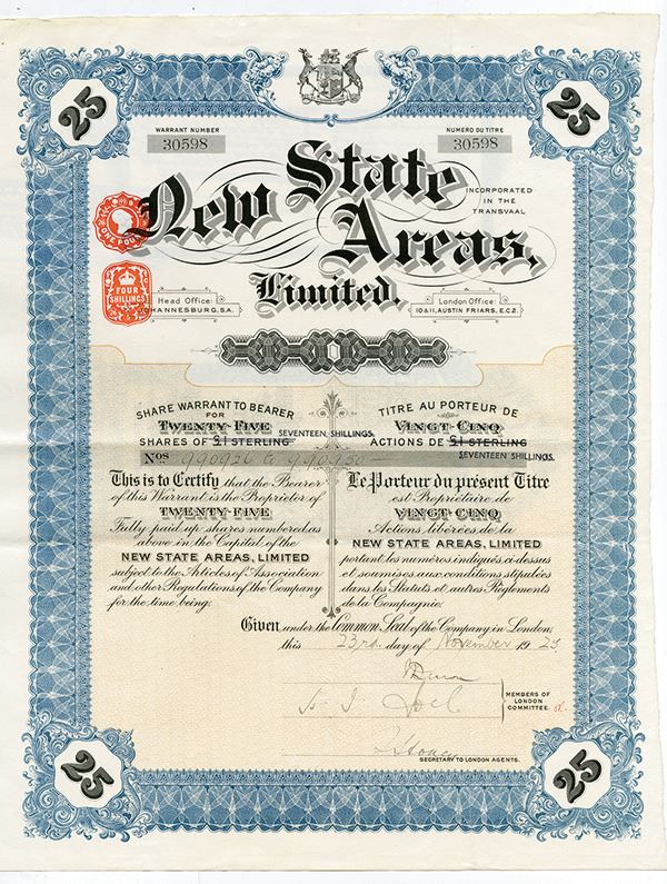 South Africa (Incorporated in Transvaal). 25 Shares Capital Stock Issued Certificate, Black print on blue border with tan under tint on large sized certificate printed in English and French, Company title at top with seal of South Africa at very top, XF condition.