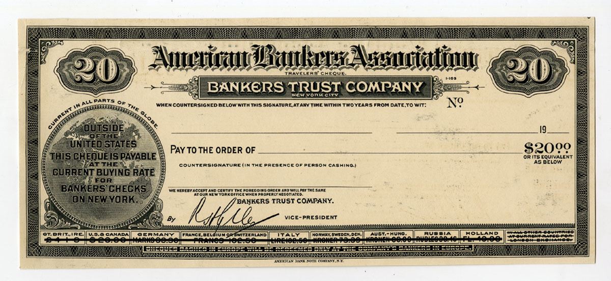 New York, ND (1900s). $20 Proof Traveler's Check, Black printing on thick paper, VF to VF+ condition with splitting at top left corner, ABNC.