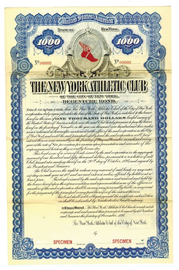 New York. $1000 Specimen 6% Debenture Coupon Bond, Black print on blue border and under tint, Company logo at top above company title, Specimen overprints and POC's, Fine condition with splitting along fold lines archivally reinforced, ABNC.