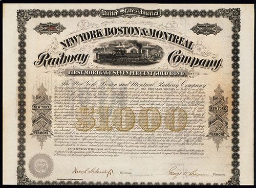 New York Massachusetts and Vermont, 1873, $1000, 7% First Mortgage Gold Bond, Issued Bond, Black on black border and underprint, Moving locomotive centered with station in background, VF-XF condition, Batch Lithographic Co.