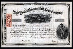 MA, CT and RI. Issued stock with one hole on upser left (possibly for storage, not cancelled). 1863. 2 Shares, #660, Black, Landscape Scene Locomotive L/R around curve & Farmer on LR, Uncancelled, Revenue Stamp attached, G.baldwin. VF condition. Scarce.