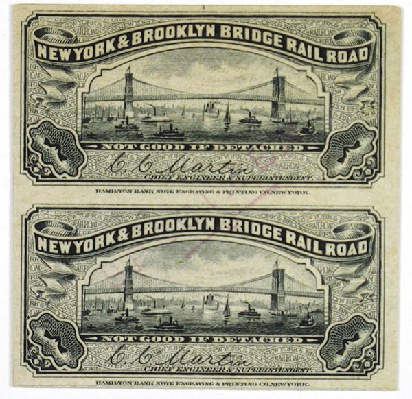New York, ND (1880s). Uncut Proof Train Ticket for the New York & Brooklyn Bridge Rail Road, Black text on thick brown cardstock, 2 x 2 inches. Blank back. From 1898 to 1950, various companies operated local trolley lines over the Brooklyn Bridge, taking passengers from many points in Brooklyn and Queens, New York City, United States to the Park Row terminal in Lower Manhattan.