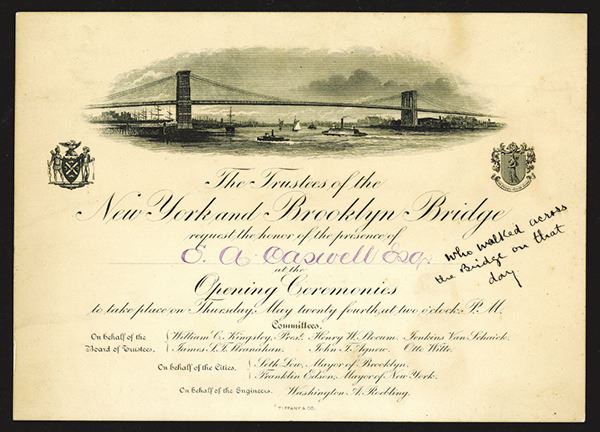 Engraved invitation by Tiffany & Co. printed on card stock. 9 x 6-1/2 inches. Bold view of the East River bridge with Tug and Ferry Boat traffic. Arms of the City of New York and the City of Brooklyn at ends. Invitee's name inked in, with an additional notation "who walked across the bridge on that day". Slight tone, four former mounting marks on back. Nice.