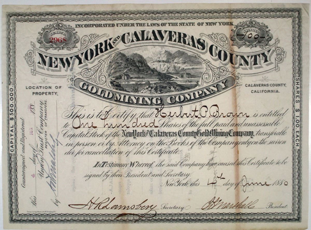 California, (Inc. in NY), 1880. 100 Shares I/U Capital Stock Certificate. Black print on black border with vignette of mine at top. Mine was located in Calaveras County California. VF condition with toning at fold lines.