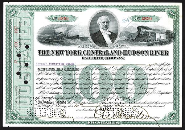 New York. 100 Shares Capitol Stock Issued and Canceled Certificate. Black print with a green border and under print. Vignette of Cornelius Vanderbilt in the center with a ship to the left and a locomotive to his right. Pin punched canceled along bottom of certificate. VF condition, ABNC.