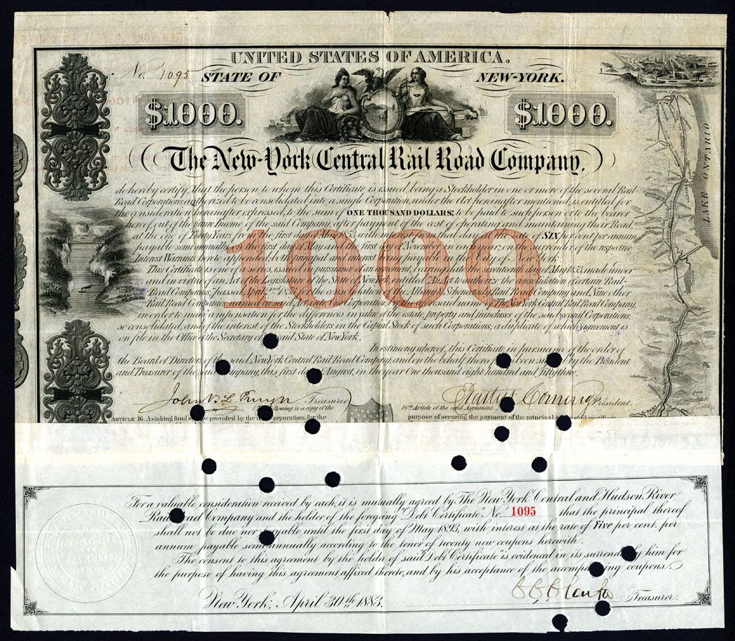 New York, $1000, 6% bond. VF. Erastus Corning, politician, Congressman from New York during the Civil War and businessman.