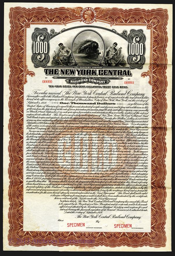 New York, $1000, Specimen 10 Year 7% Collateral Trust Gold Coupon Bond, Black on brown border and underprint, Speeding Locomotive flanked by men, Specimen overprints, VF, Unlisted Bond variety in Cox, only known as a registered bond, not a coupon bond and also unlisted denomination. Amazing and rare bond. ABNC.