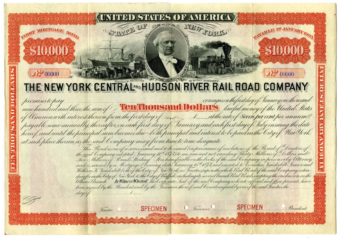 New York. Specimen $10,000, 7% 1st Mortgage Bond Payable in 1903. Black on red border, Vanderbilt in middle flanked by steamship and locomotive, Blue "00000" serial numbers, Specimen overprints and POC's, Only listed as a specimen in cox. This is the only example available out of the 2 found in the ABN Archives in 2002.