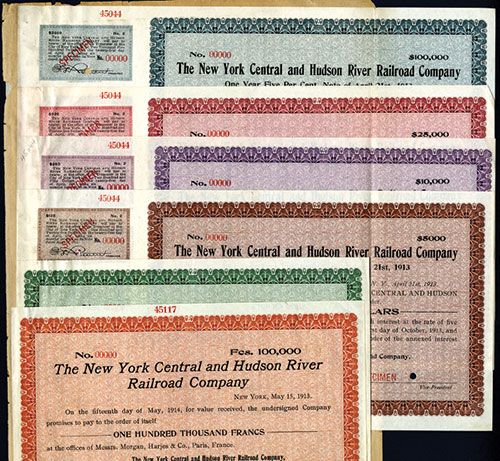 New York, 1913, $10000-$25000-$10000-$5000-1000 Sterling-100000 Francs, Orange, Green, Brown, Purple, Red, Navy Blue Borders and underprint, No vignettes, VF condition, ABNC. Attached to back of bonds is a typed board of resolutions notice allowing treasurer and president to borrow to a maximum $4 million.