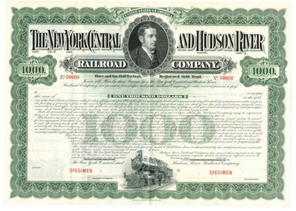 New York. $1000 Specimen 3 1/2% Registered Gold Bond, Black print on green border and under tint in horizontal format, Portrait of company founder at top, Specimen overprints and POC's, VF-XF condition, ABNC.